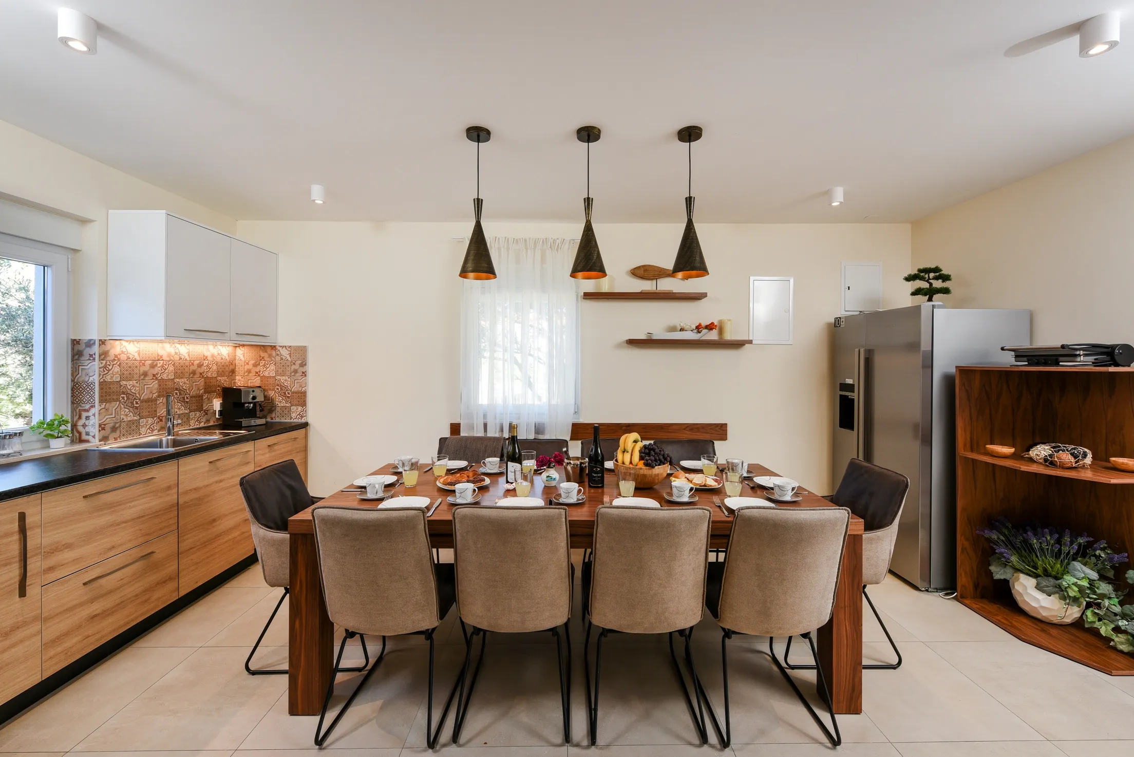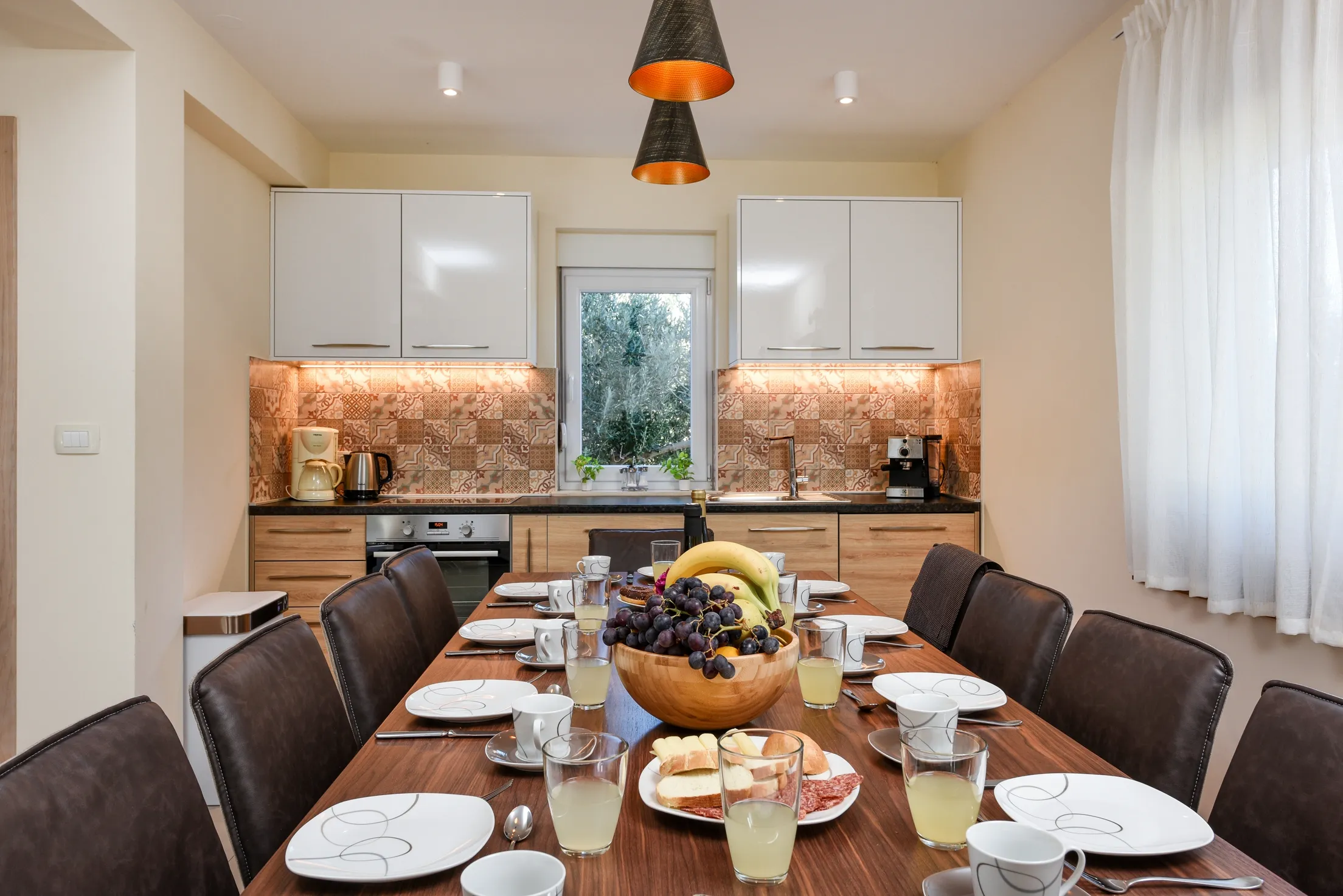 The ground floor of villa Goga consists of a charming, fully equipped kitchen with a comfortable dining area and a beautiful, sun-soaked living room. Large glass walls connect the interior with the outdoor terrace, creating a seamless flow between spaces.